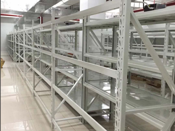 中型貨架,屬于倉儲貨架的一種,擱板貨架類型,通常貨架承載200kg/-600kg層。橫梁與立柱片掛接組裝成框架,最后鋪設(shè)鋼層板.