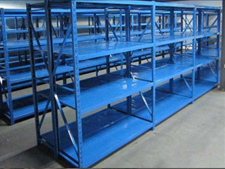 中型貨架,屬于倉儲貨架的一種,擱板貨架類型,通常貨架承載200kg/-600kg層。橫梁與立柱片掛接組裝成框架,最后鋪設(shè)鋼層板.